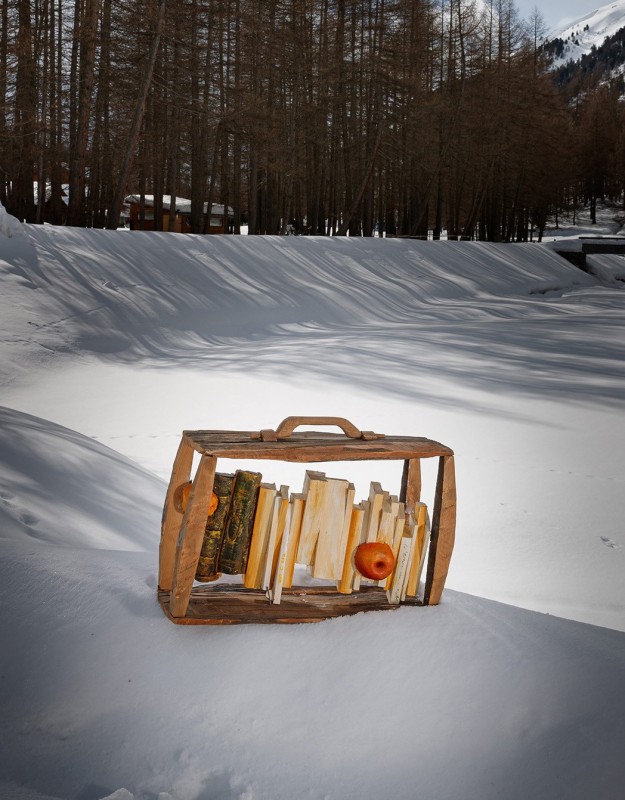 ... è una valigia con dei libri, anch'essi contenitori di storie. Mi piace pensare di prendersi del tempo per leggere con una certa spensieratezza, magari mangiandosi una mela.
