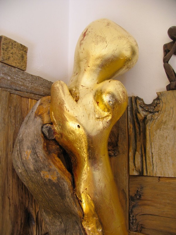 Legno antico, foglia oro, cirmolo intagliato con inserto di scultura