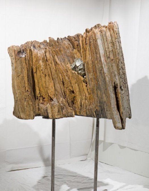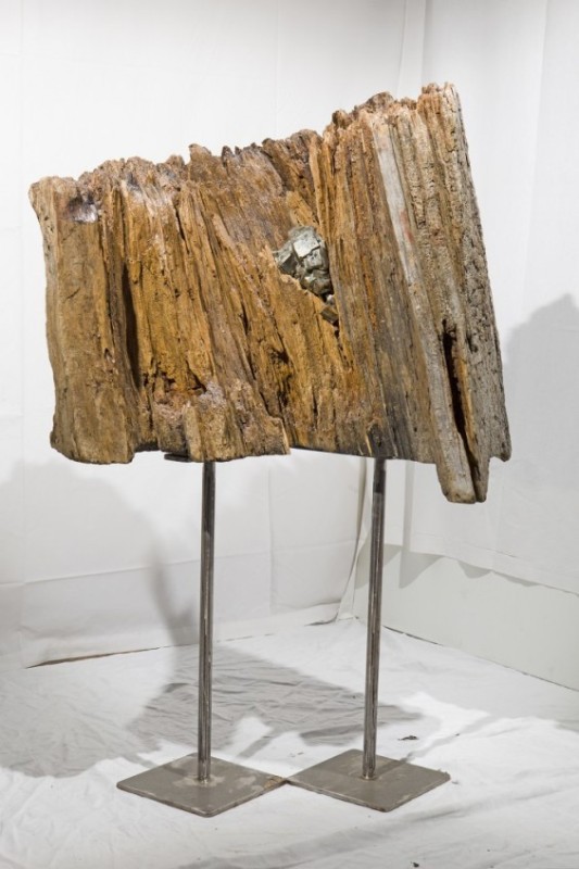 Legno antico trattato, lavorato con inserti di pirite.