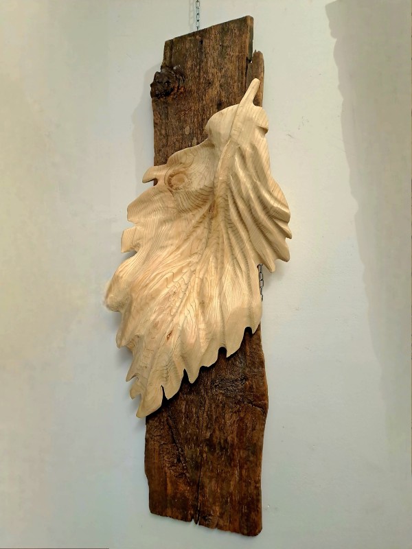 La foglia leggera e luminosa è stata sospesa e fissata su un'antica asse di legno scuro. Questa tavola, vissuta e segnata dal tempo, porta con sé storie e memorie, rappresentando la nostra base, le nostre radici, il passato che ci sostiene. Il colore profondo del legno antico esalta la chiarezza e la delicatezza del cirmolo, creando un dialogo visivo affascinante.