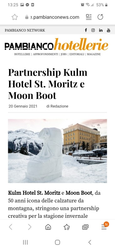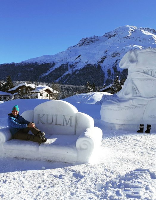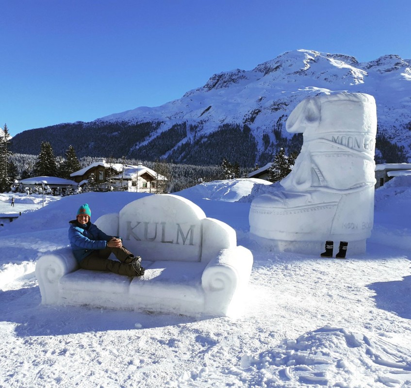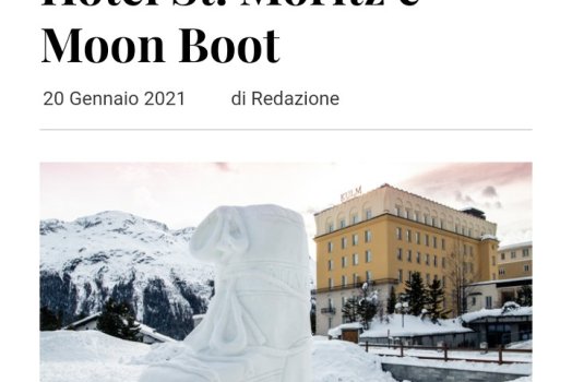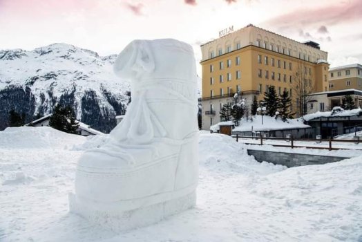 Scultura di neve alta 4 metri realizzata a St. Moritz. Kulm Hotel e Moon Boot, da 50 anni icona delle calzature da montagna, stringono una partnership creativa.
